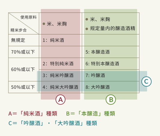 于1989(平成元)年受到规定, 在1990(平成2)年正式使用, 根据使用的原料、精米歩合分为8种类。特定名称酒, 可分为以下的3组。- A